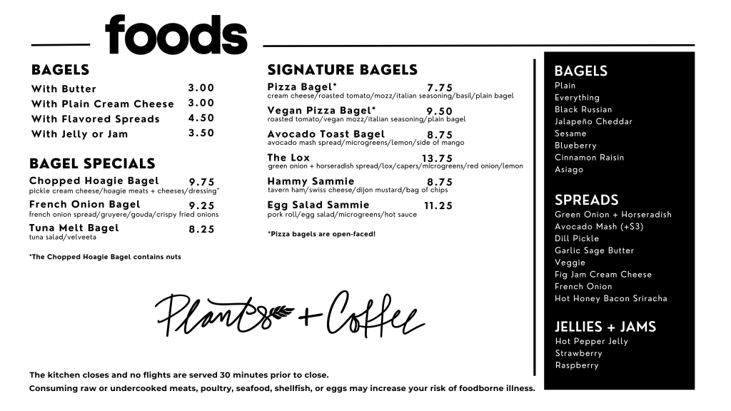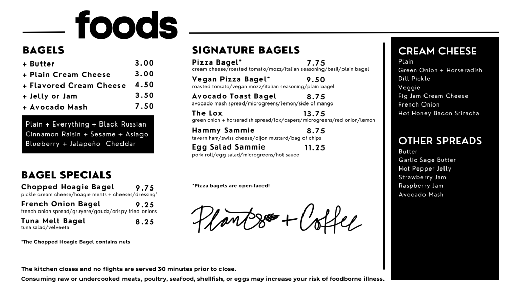 We are a family-owned coffee shop with roots in the houseplant world and a love for yummy lattes and delicious locally baked bagels. We pride ourselves in our unique food + drinks creations and relaxing café dining experience.